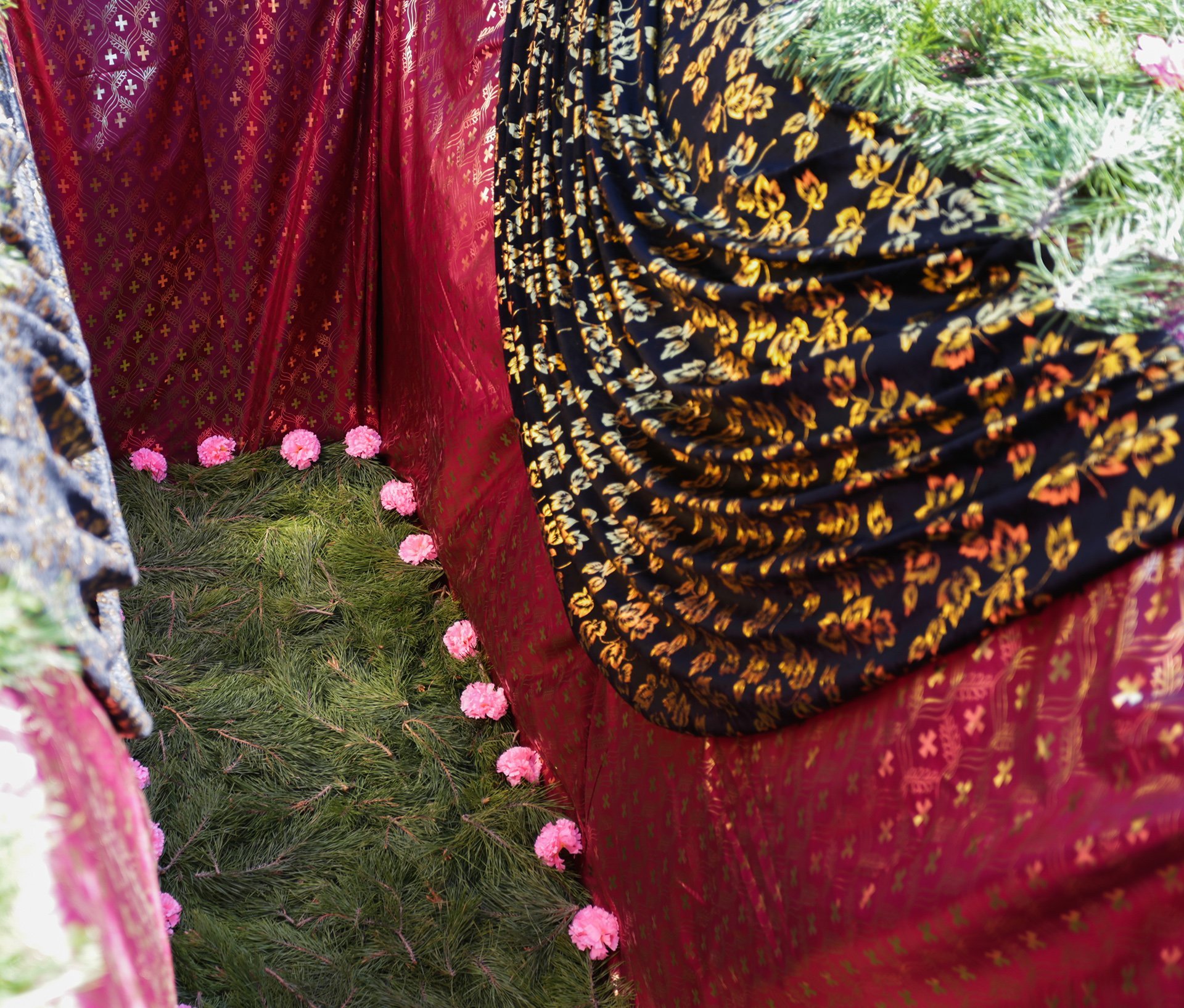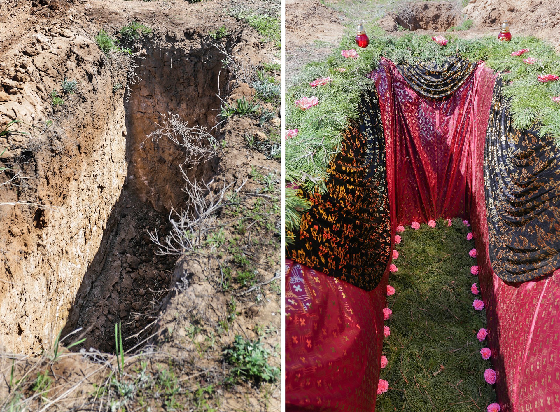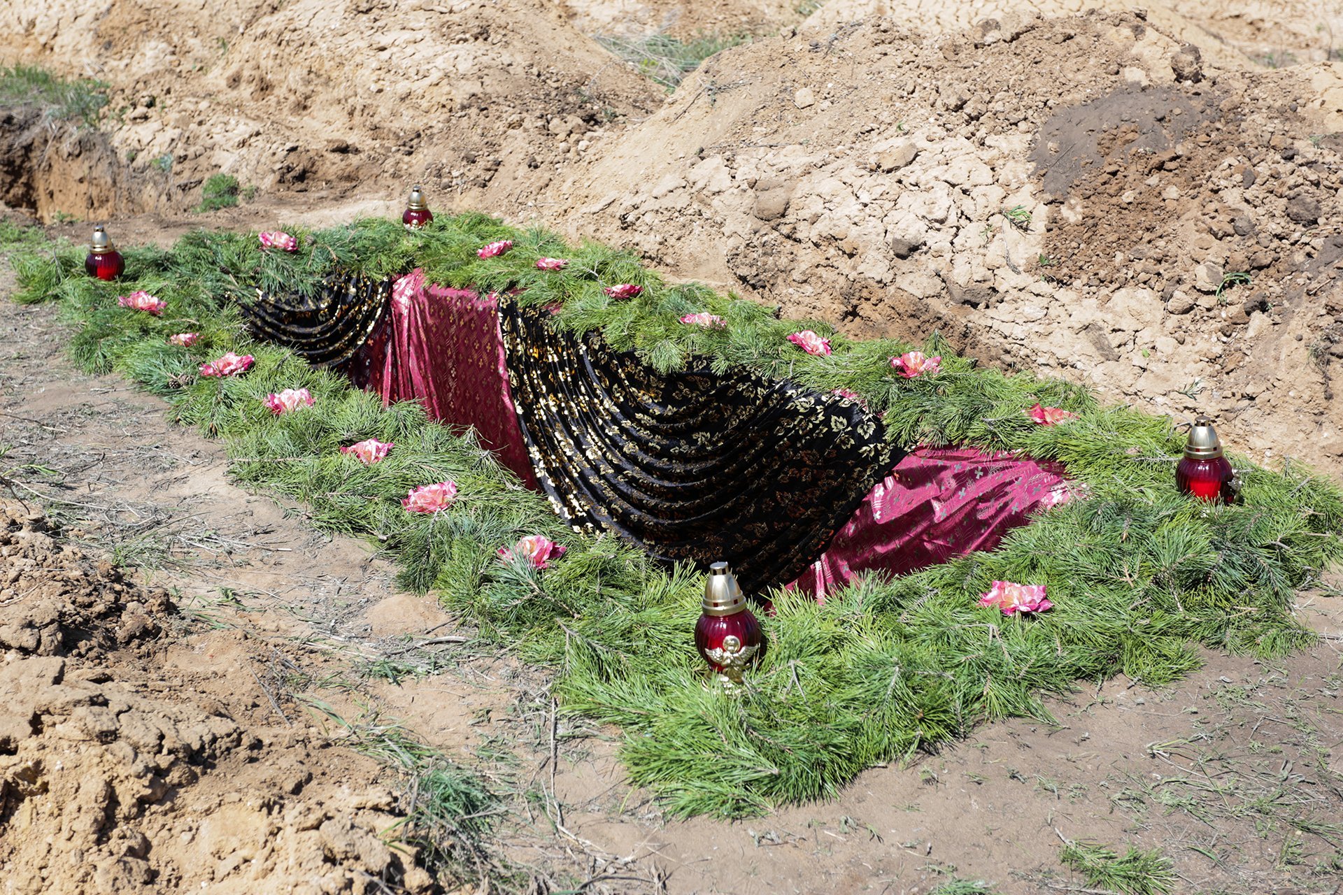 Могила накрывается специально-драпированной тканью и придаёт церемонии торжественный вид. Драпировка стен могилы тканью закрывает огрехи после колки могилы: свисающие корешки травы, крупные коренья деревьев и выступающие камни.