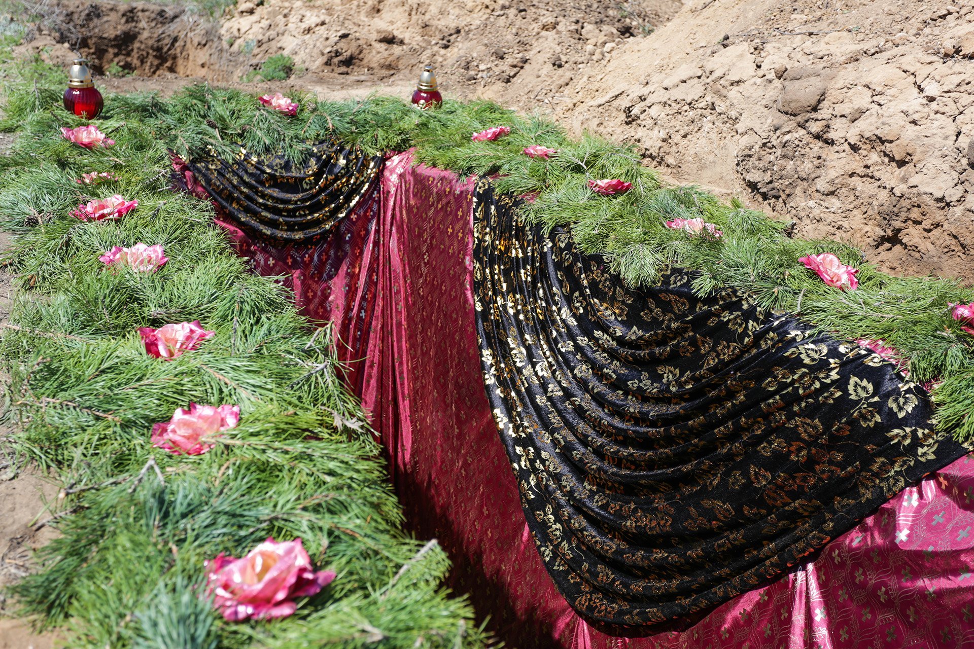 Комплект ткани для драпировки стен могилы в тёмно-бордовых тонах монтируются до приезда траурного кортежа на заблаговременно выкопанную и предварительно подровненную могилу. После того, как гроб опущен в могилу и все участники траурной церемонии бросили по три горсти земли на крышку гроба, драпировка остаётся в могиле и засыпается землёй вместе с гробом. Комплект ткани для драпировки могилы шьются для каждого зохоронения индивидуально и используются только один раз, чем и обусловлена немалая стоимость этой трудоёмкой работы.