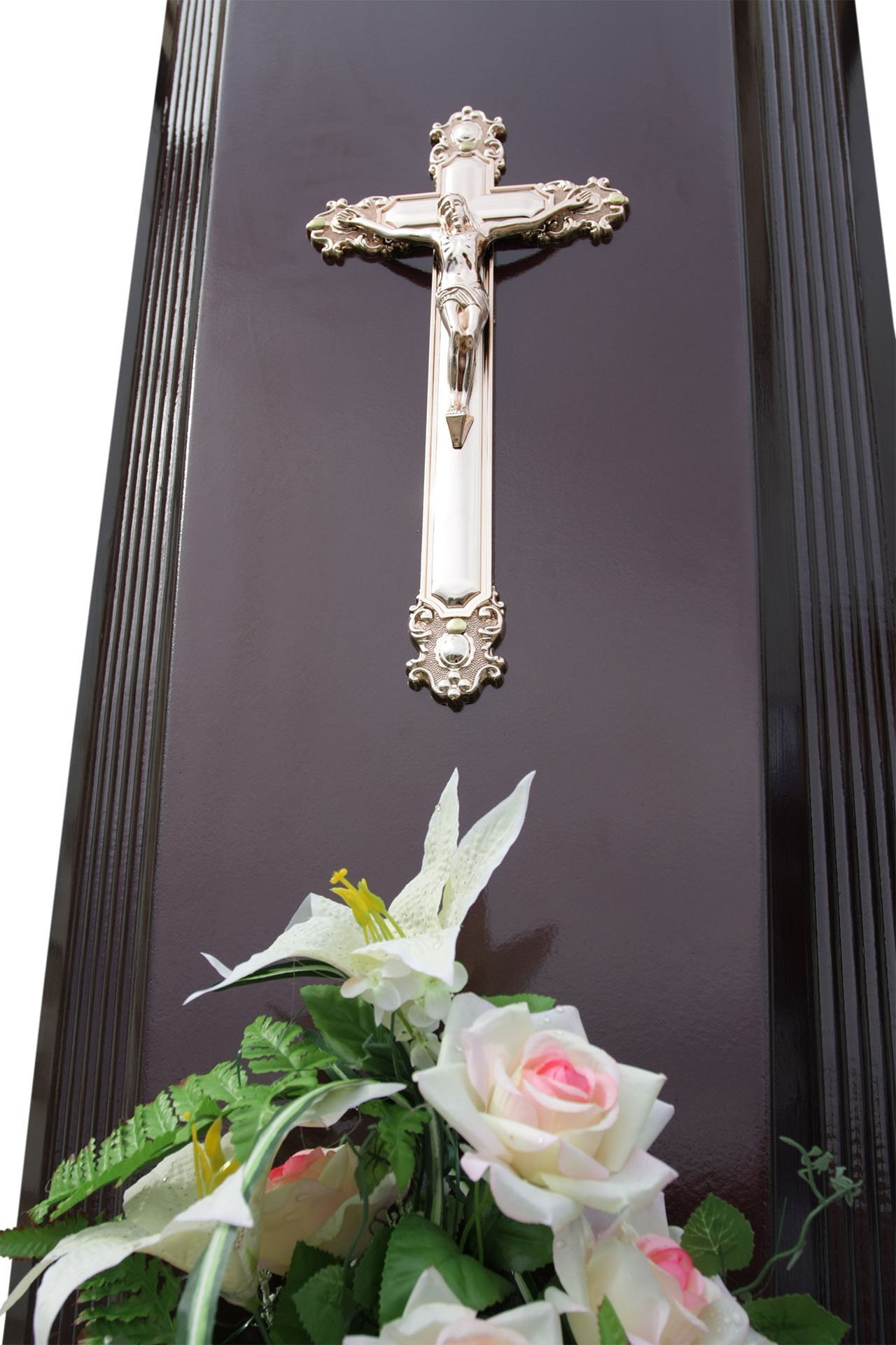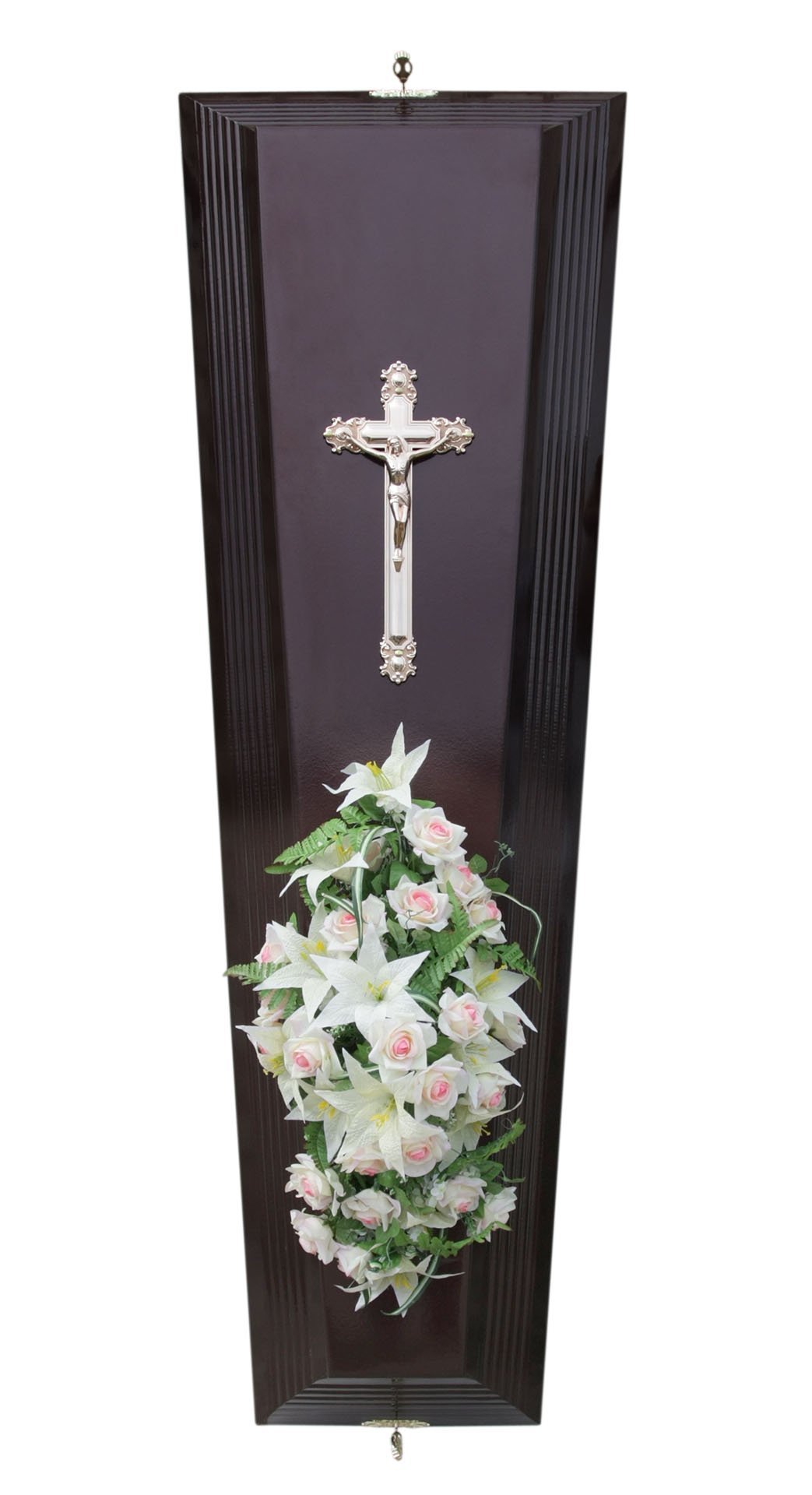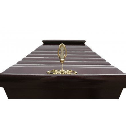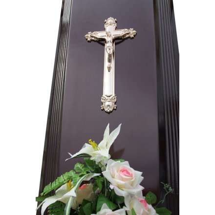 Крышка гроба «Ренессанс» украшена прощальной цветочной композицией – это не только дань традициям и часть ритуального обряда, но еще и эстетическая составляющая каждой похоронной церемонии. Фиксируется крышка на гробе металлизированными завёртками с декоративными накладками золотого цвета.
