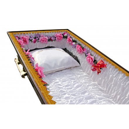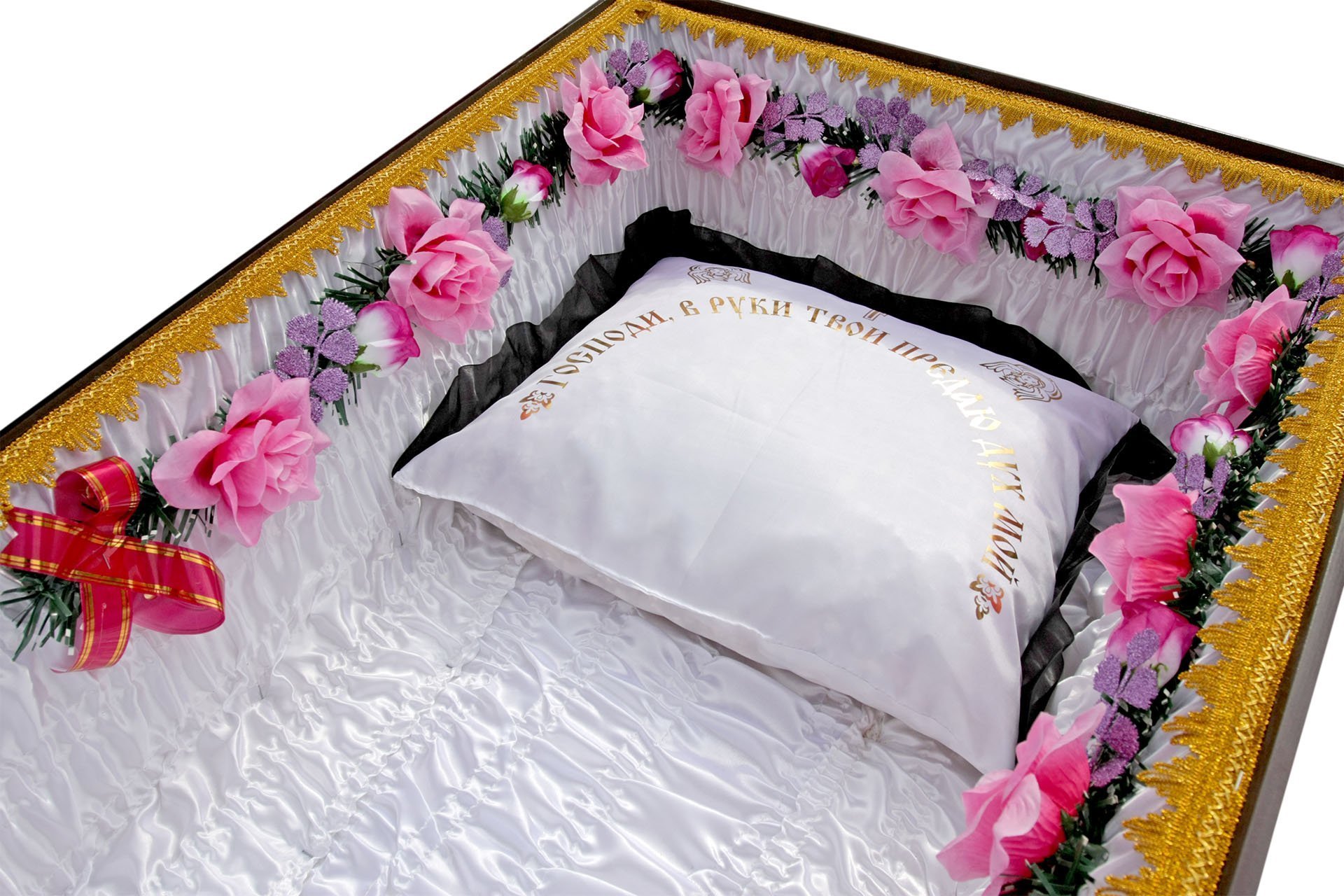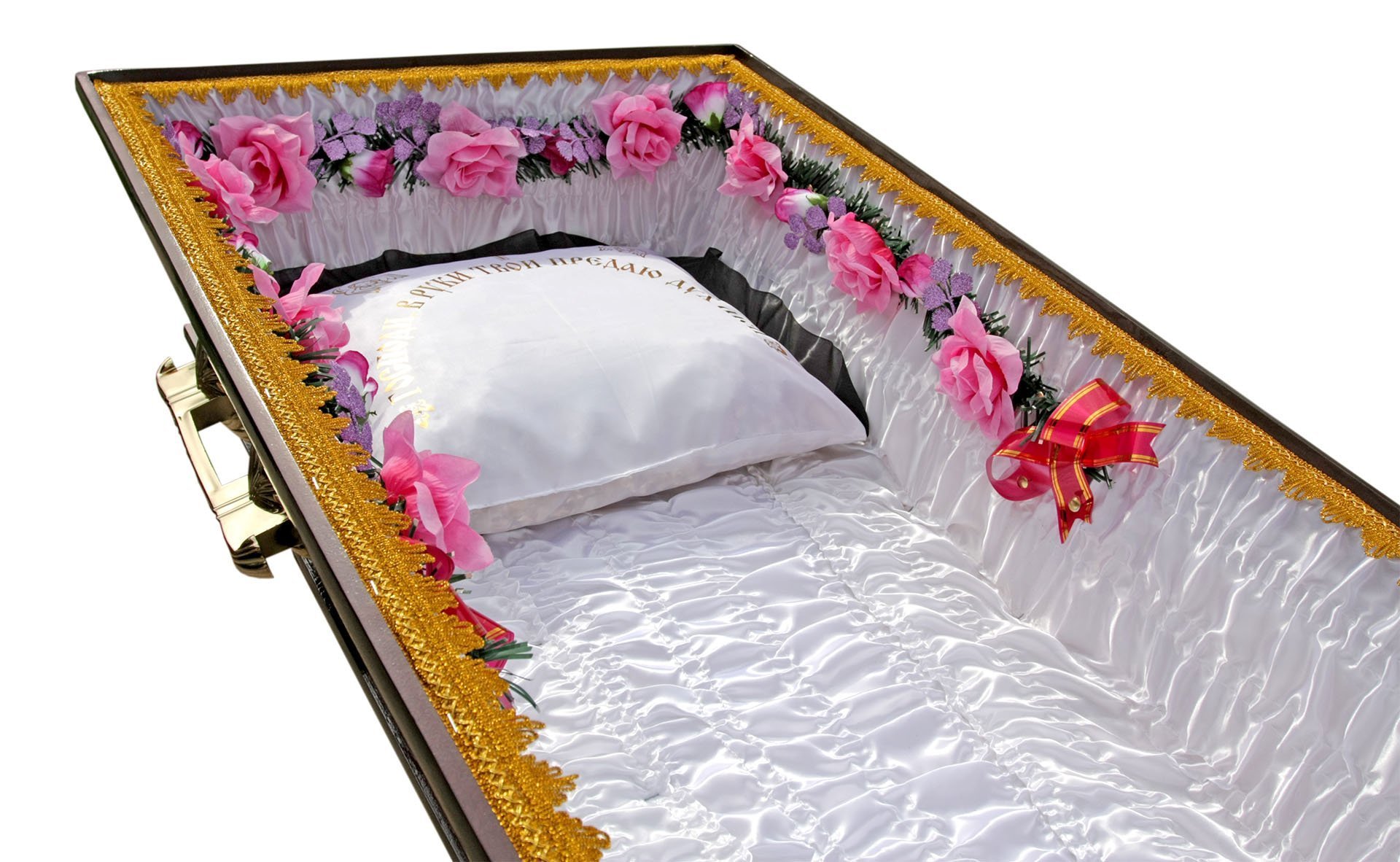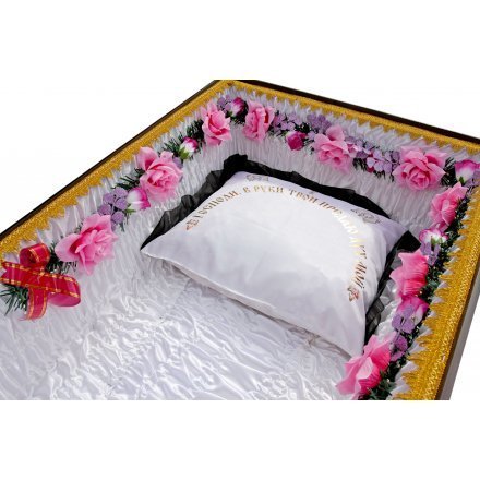 Но натуральные подушки всегда выглядят презентабельнее синтетических, хотя и обходятся дороже. В подушках и постелях всех продаваемых у нас гробов, наряду с древесной стружкой, присутствует трава, пролежавшая три дня в Православном Храме во время Светлого праздника Святой Троицы. Подушка украшена лентой и орнаментами, связанными с религиозной тематикой.