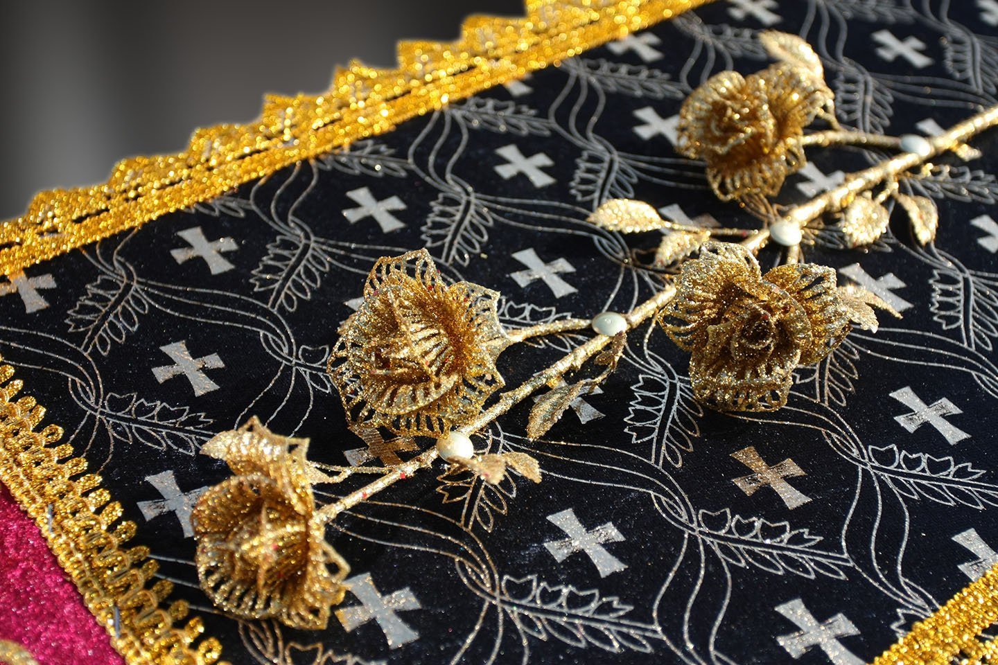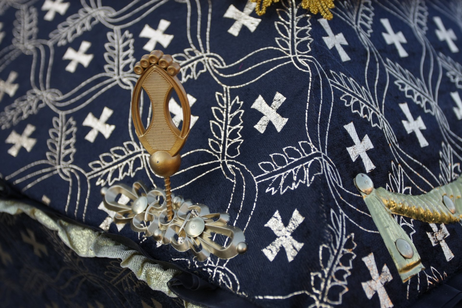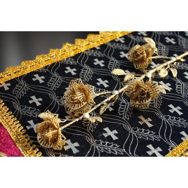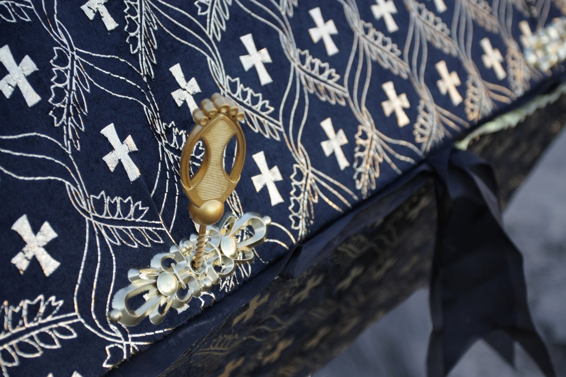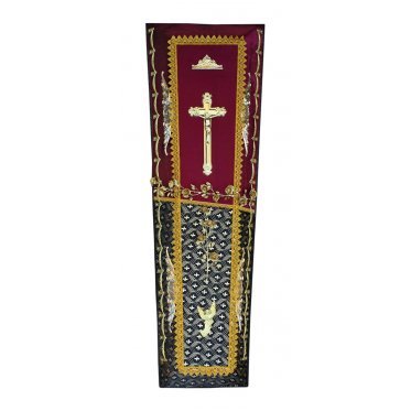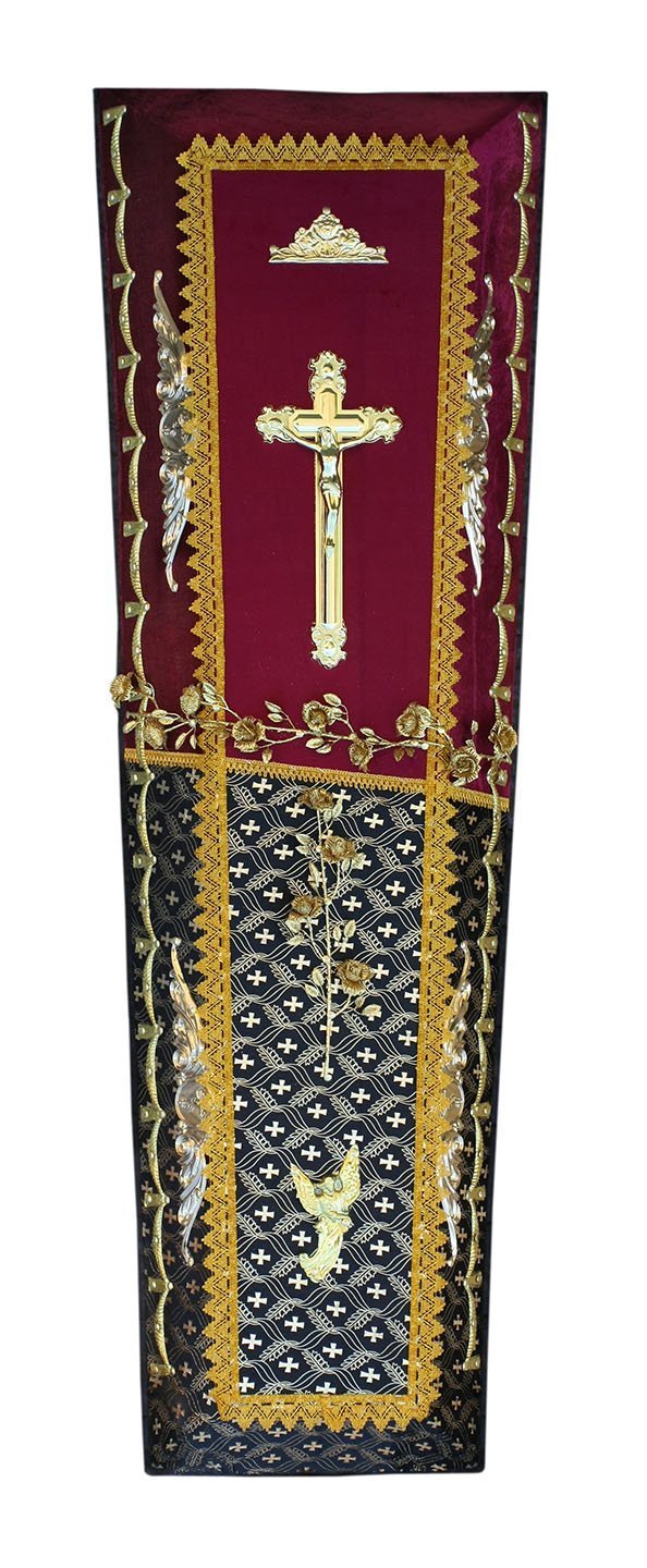 Ложе гроба драпировано внутренней обивкой из шёлка. В изголовье гроба находится гирлянда, обрамляющая голову усопшего. Траурная гирлянда придаёт особую торжественность прощанию с покойным, и являются выражением особой печали и скорби. Гирлянда используется во время похоронной процессии, а также для возложения на месте захоронения или украшения установленного на могиле креста.