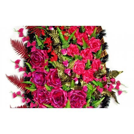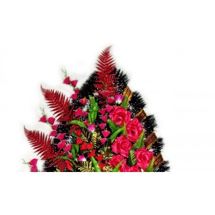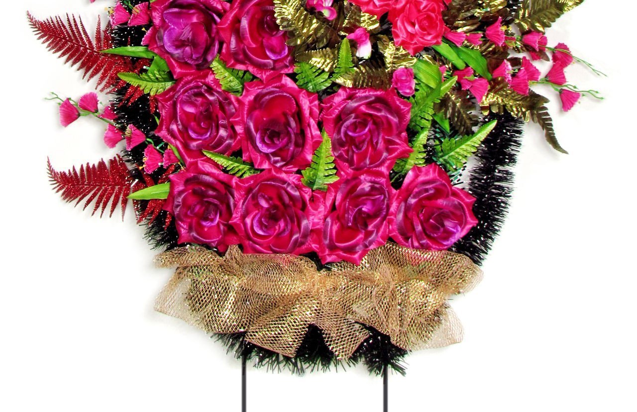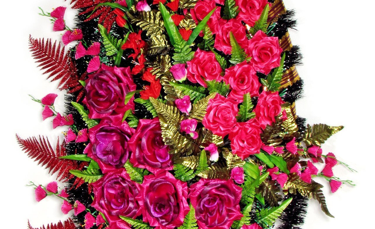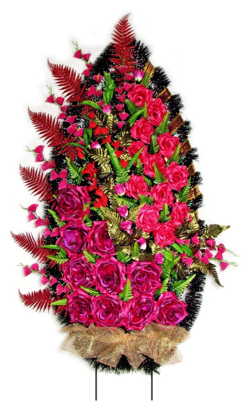 Дизайнерский траурный венок **ПРОЩАЛЬНЫЙ ЗАКАТ** высотой 160 см выполнен из красных и рубиновых роз с пурпурными оттенками в сочетании с мелкоцветными гладиолусами дополненных декоративной зеленью и алыми мерцающими папоротниками. В основании композиции траурная сетка с позолотой.
