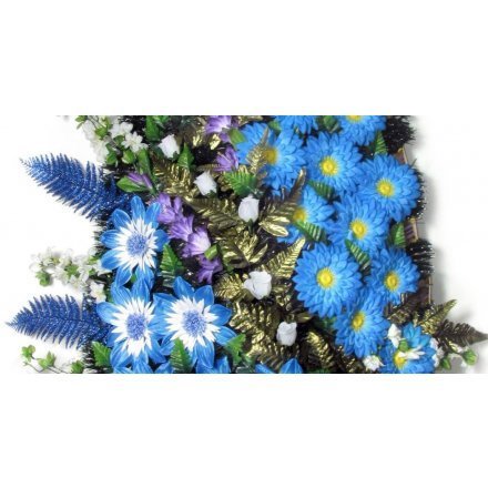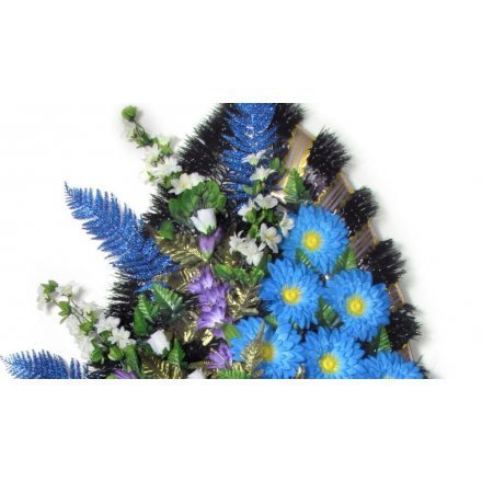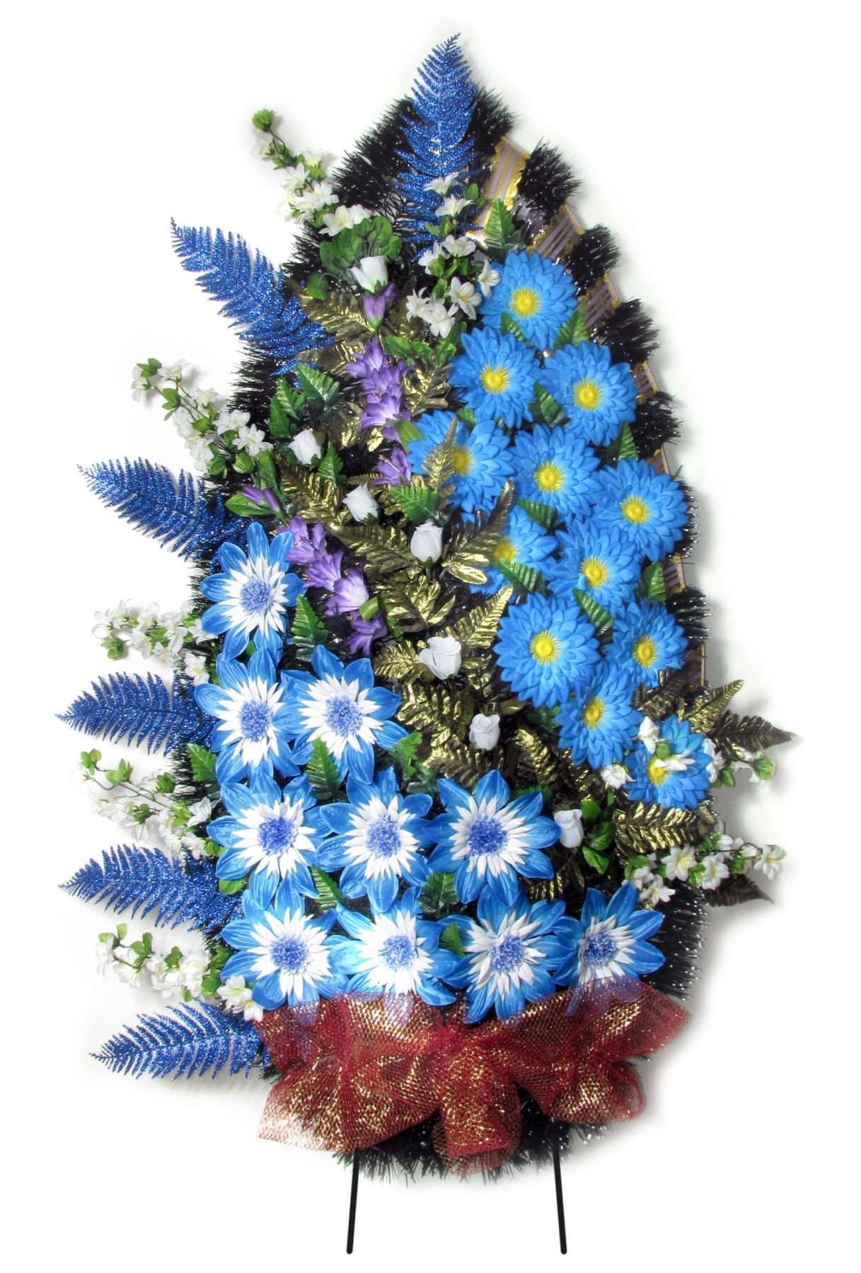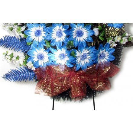 Дизайнерский траурный венок «Безмятежные небеса» высотой 160 см изготовлен из голубых гербер и фантастических георгинов, украшенных декоративной зеленью, синими дельфиниумами и мерцающими папоротниками.