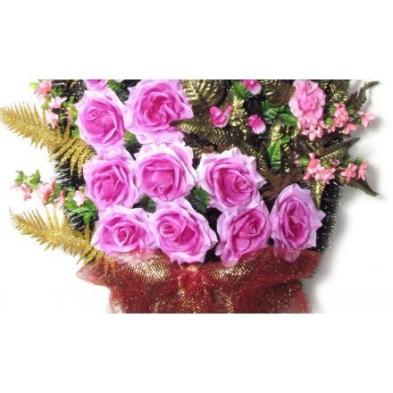 Дизайнерский траурный венок «Сиреневый туман» высотой 160 см выполнен из лиловых и фиолетовых роз в сочетании с сиреневыми колокольчиками дополненных декоративной зеленью и золотыми мерцающими папоротниками. В основании композиции траурная сетка с позолотой.